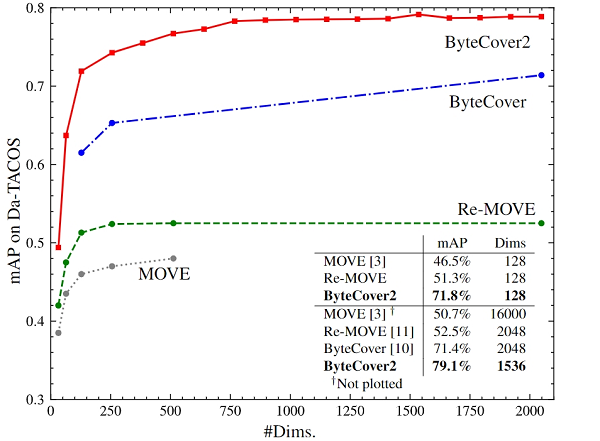结果展示:一直以来 Da-Tacos 作为用来评估翻唱识别的基准测试数据集被使用,在该数据集上采用 1536 维的 ByteCover2 模型取得了远超其他方案的 SoTA 性能,全类平均正确率指标 (mAP) 达到 79.1%;而 ByteCover 系列以外的最好方法 Re-MOVE 的该项指标只有 52.5%,更加值得被提及的一点,128 维的 ByteCover2 模型甚至超过了 2048 维的 ByteCover1 和 Re-MOVE 方法。