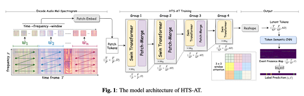 《HTS-AT: A HIERARCHICAL TOKEN-SEMANTIC AUDIO TRANSFORMER FOR SOUND CLASSIFICATION AND DETECTION》