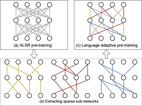 该工作提出了一种基于稀疏共享结构的多语言语音表征学习方法,即从模型中划分出多个稀疏子网络来分别对不同语言进行建模,进而实现语言自适应训练,每个语言的子网络都通过裁剪不重要的参数进行提取。