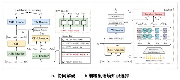 该工作在一种被称为协同解码(Collaborative Decoding, ColDec)的语音识别定制化 / 个性化方法的基础上,提出了细粒度语境知识选择机制(Fine-grained Contextual Knowledge Selection),来进一步增强该方法在大热词列表和较多干扰热词情境下的语音识别定制化性能。在先前工作中,一种被称为协同解码(Collaborative Decoding)的语音识别定制化技术有效地提升了定制化识别性能。