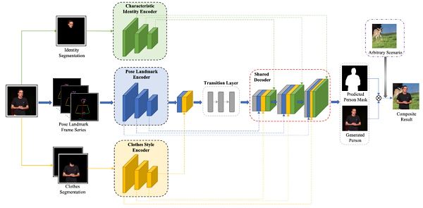 该方向致力于解决视频中人物个性化穿搭和背景场景自由的选择问题。创新上,设计了多个解耦 encoder 学习人物不同的属性(身份,衣服和姿态),通过共享 decoder 融合多层面信息。
