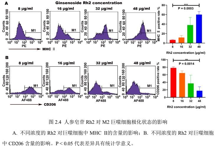 人参皂苷Rh2能使巨噬细胞中CD206的染色阳性率显著下降,同时导致MHCⅡ的染色阳性率明显升高,且这种效应的强度随着Rh2浓度的增加而逐渐增强。说明人参皂苷Rh2能使M2巨噬细胞向M1亚型极化,且此效应与Rh2的浓度呈正相关。