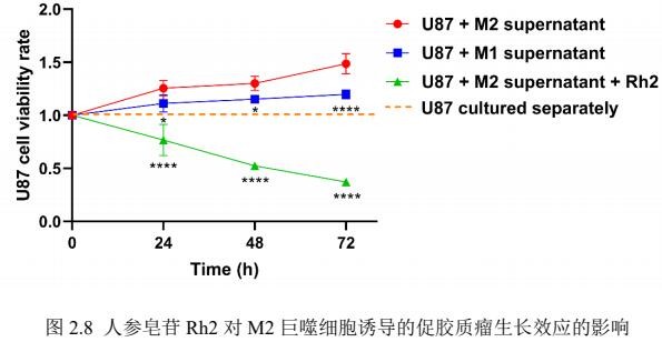 通过上述实验,我们可以看到人参皂苷Rh2可以通过降低胶质瘤细胞中M2型细胞比例,从而在生物体内发挥抗胶质瘤效应。