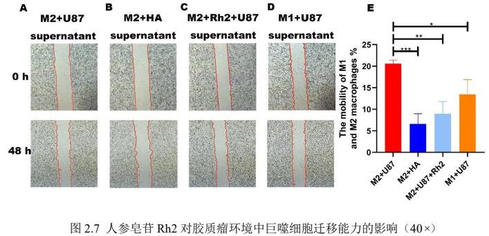 M2巨噬细胞的迁移率明显降低。这表明Rh2显著抑制了胶质瘤诱导的增强M2巨噬细胞迁移能力的效应。