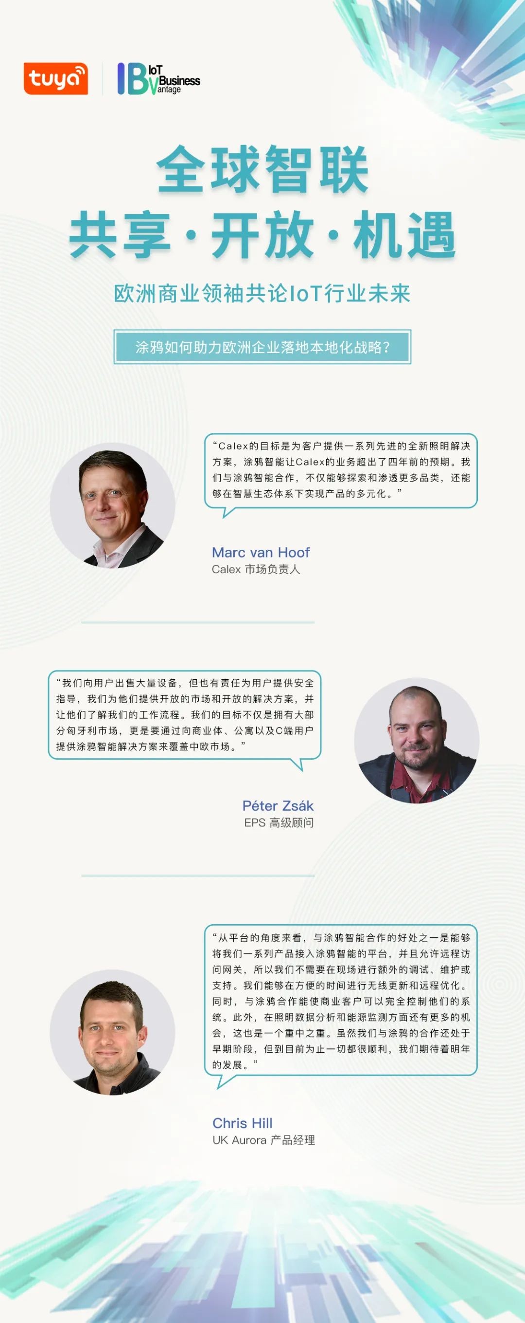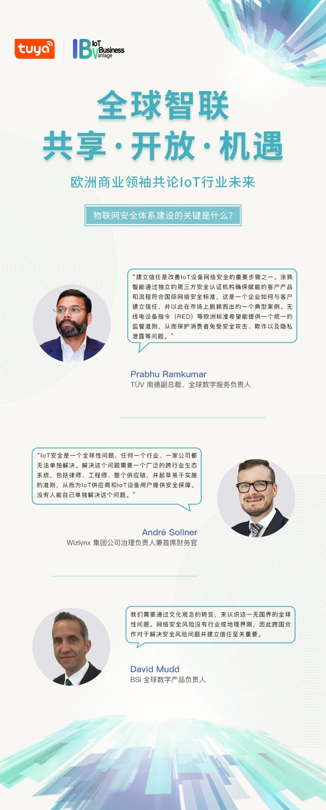 随着IoT行业由蓄力期进入增长期,企业用户对物联网的认知高度正在飞速提升,先行者们愈发脚踏实地,他们不仅青睐易部署、切实好用的物联网方案,更愿意将物联网方案应用于核心业务和关键场景的改造中。在物联网爆发之际,涂鸦智能邀请物联网领域相关企业和媒体围绕“IoT平台价值”、“欧洲IoT本地化战略”、“IoT行业安全体系建设”三大议题进行探讨,是对行业发展历程的总结与回顾,亦是对行业未来的前瞻。