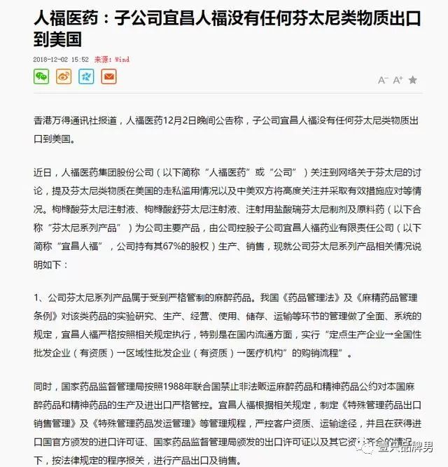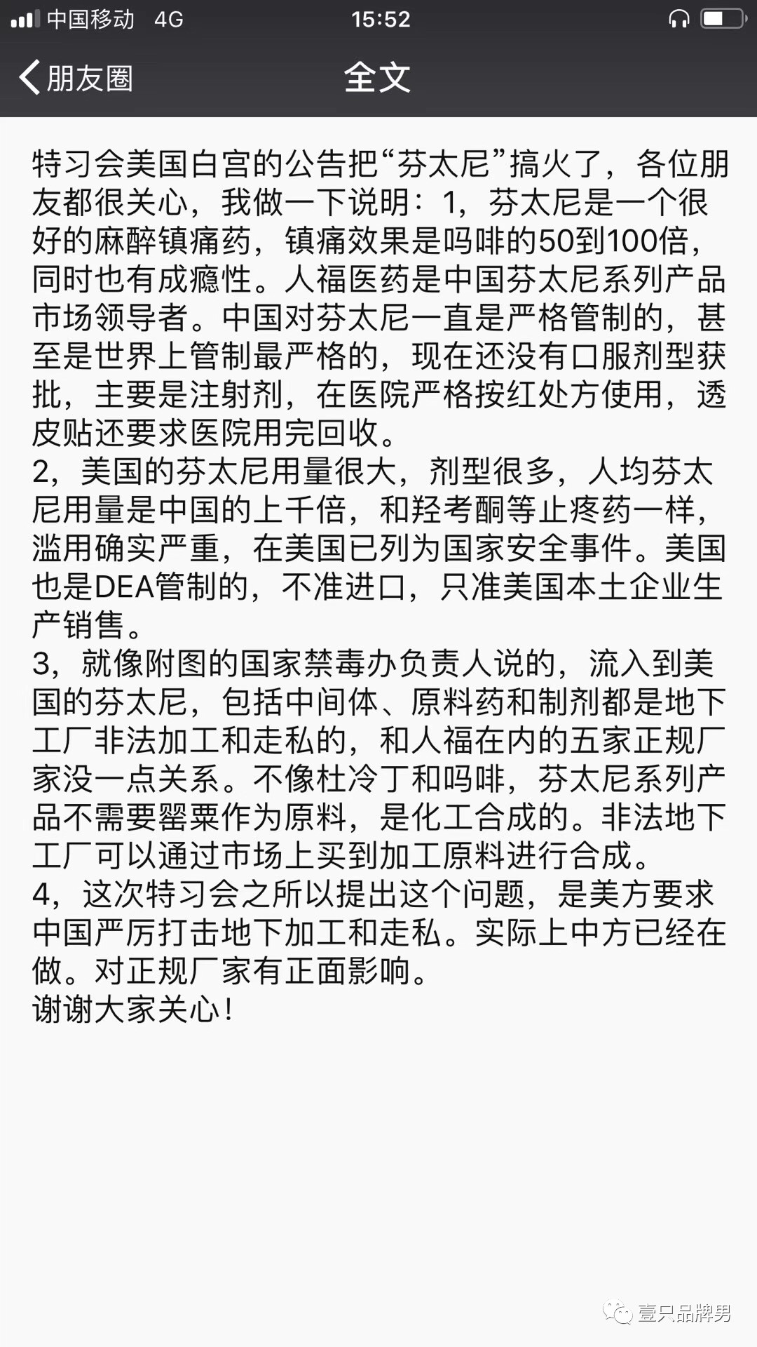 今天,陷入新闻事件中的“芬太尼概念股”人福医药的董事长王学海,也在朋友圈以留言的方式对此做出了回复: