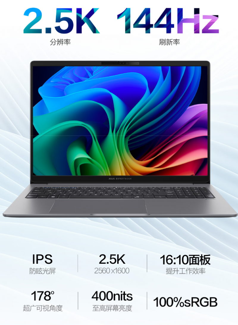 屏幕方面,华硕破晓6S锐龙版选用的是16英寸2.5K高刷新率大屏;88%的高屏占比为用户提供更广阔的视野,144Hz刷新率则确保页面滚动和视频播放流畅自然;拥有100% sRGB高色域覆盖,至高支持400nits屏幕亮度,色彩表现出色,同时屏幕在强光环境下仍保持清晰可见;内置硬件级防蓝光功能,长时间使用也能保持舒适,有效减少视觉疲劳。