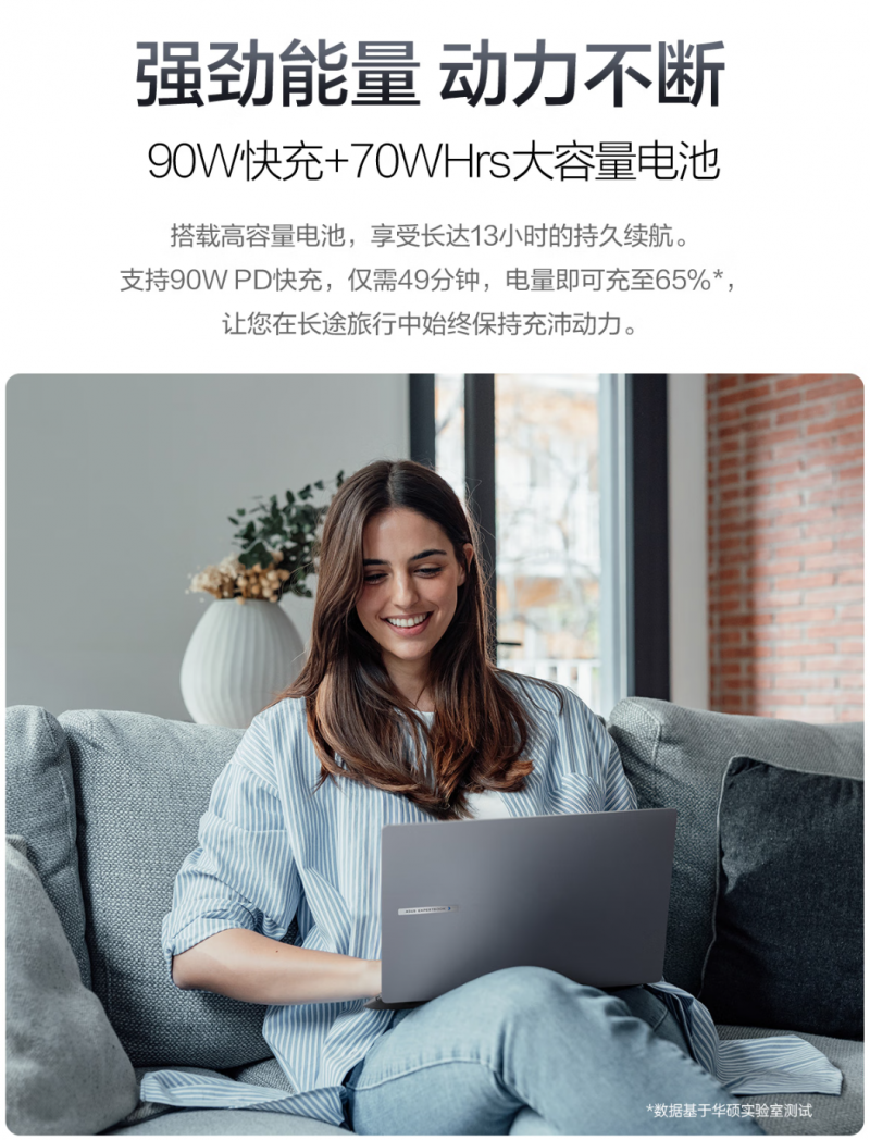 对于经常外出办公的用户而言,续航能力至关重要。华硕破晓6S 锐龙版搭载70Whrs大容量电池配合高能效处理器,至高提供13小时的持久续航可满足用户全天候移动办公需求;支持90W PD快充,仅需49分钟,电量即可充至65%,让用户在短暂休息时间即可为整机恢复大部分电力,确保工作不中断,免除电量告急的困扰。