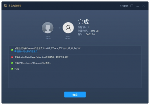 步骤5.迁移完成后,点击“确定”。需要重新启动计算机以刷新所有传输的信息。